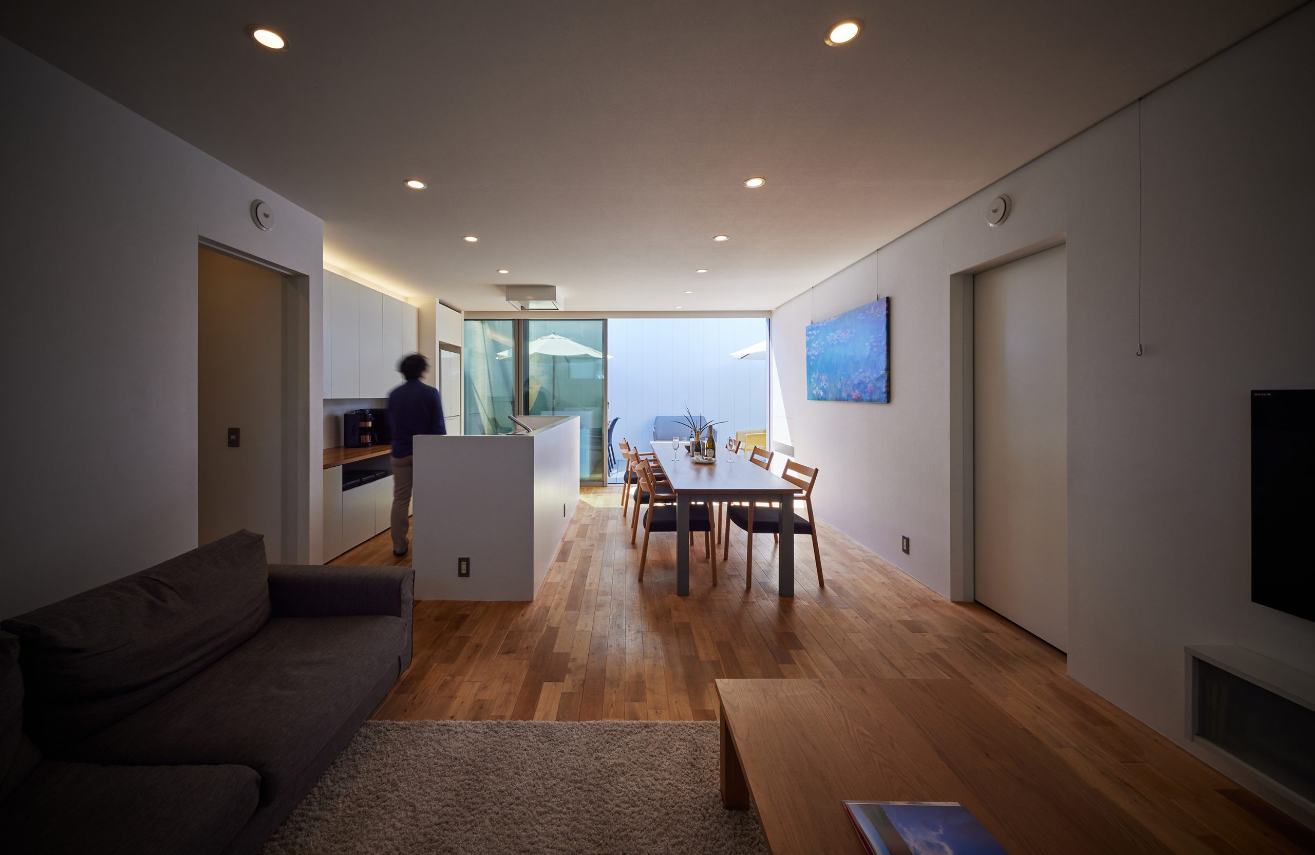 部屋から部屋へ移動するには、必ずこの庭を通らなければ行けない、雨が降ったら、わざわざ傘を差さなければならない、実に面倒です。しかし天気のいい日には、思いがけない解放感が家の中まで生まれます。狭くても豊かな住宅を作りたいと願い、そして取り組んだ結果の住宅です。